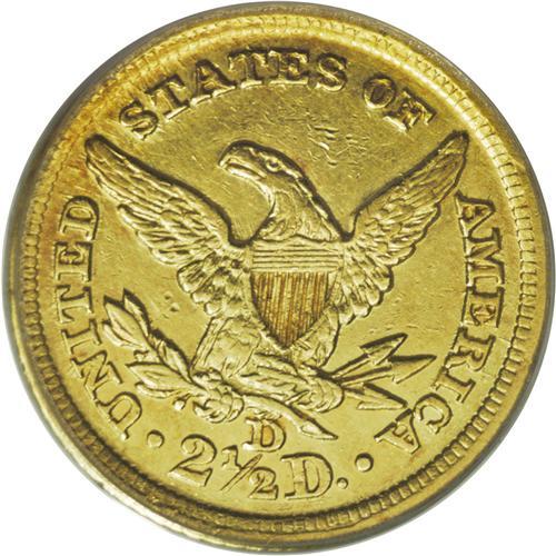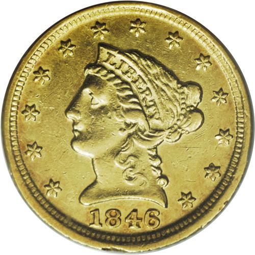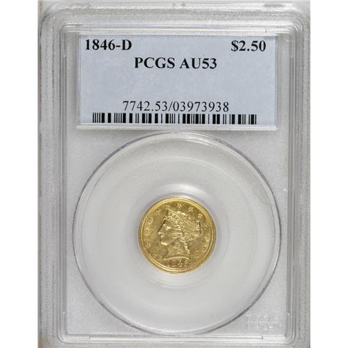 <B>1846-D $2 1/2 AU53 PCGS.</B></I> Variety 7-J. A sharply struck example with relatively clean surfaces and a pleasing quotient of remaining luster. An obverse rim mark is noted at 6 o'clock. Like all Dahlonega quarter eagles, the 1846-D is low mintage. Just 19,303 pieces were struck. Population: 10 in 53, 32 finer (2/07).<BR><BR><b>Shipping:</b> Coins & Currency (<a target="_blank" href="http://www.heritageauctions.com/common/shipping.php">view shipping information</a>)