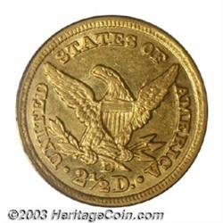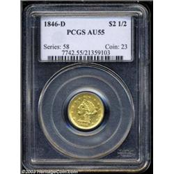 <table><tr><td><TABLE cellSpacing=0 cellPadding=0 width="100%" bgColor=#000000 border=0><TBODY> <TR><TD width="100%"><TABLE cellSpacing=1 cellPadding=3 width="100%" border=0><TBODY><TR><TD width="100%" bgColor=#79735c><FONT face=arial color=#ffffff size=3><B>Description</B> </FONT></TD></TR><TR><TD width="100%" bgColor=#ffffff><FONT face=arial size=2><B>1846-D $2 1/2 AU55 PCGS.</B></I> Winter 8-K, First Edition. An extremely rare die pairing that features an entirely different obverse die than is used on other '46-D Quarter Eagles, the date being placed closer to the bust. On the reverse, the arrow feather extends out from the left side of the mintmark. Lustrous green-gold surfaces are reasonably sharp and have subtle orange highlights.<BR><I>From The New Millennium Collection.</B></I> </FONT></TD></TR></TBODY></TABLE></TD></TR></TBODY></TABLE><BR><A name=PricesRealized></A><TABLE cellSpacing=0 cellPadding=0 width="100%" bgColor=#000000 border=0><TBODY><TR><TD width="100%"><TABLE cellSpacing=1 cellPadding=3 width="100%" border=0><TBODY><TR><TD width="100%" bgColor=#79735c><A name=PR><FONT face=arial color=#ffffff size=3><B>Previous Prices from Heritage Auctions</B> </FONT></A></TD></TR><TR><TD bgColor=#f6f6ed><TABLE cellSpacing=0 cellPadding=0 width="100%" border=1><TBODY><TR><TD align=middle width="33%"><B>Date</B></TD><TD align=middle width="33%"><B>Service</B></TD><TD align=middle width="33%"><B>Price</B></TD></TR><TR bgColor=whitesmoke><TD width="33%"><B>02/12/1999</B></TD><TD width="33%">NGC</TD><TD width="33%">$4,025.00</TD></TR><TR bgColor=whitesmoke><TD width="33%"><B>06/06/1998</B></TD><TD width="33%">NGC</TD><TD width="33%">$4,140.00</TD></TR><TR bgColor=whitesmoke><TD width="33%"><B>11/01/1995</B></TD><TD width="33%">PCGS</TD><TD width="33%">$4,620.00</TD></TR></TBODY></TABLE></TD></TR><TR><TD bgColor=#ffffff><FONT face=arial size=1 ?>PLEASE NOTE: All prices realized reflect the final hammer price PLUS the buyer's premium in auctions that charge a buyer's premium. Each item has a notation at the top of the listing indicating whether that lot included a buyer's premium. Example: A item that sells with a final hammer price of $100 and a 20% buyer's premium will display with a price realized of $120. All information listed is intended to be as accurate as possible, but errors are possible. Please use this guide carefully and inform us of any inaccuracies. </FONT></TD></TR></TBODY></TABLE></TD></TR></TBODY></TABLE><BR><TABLE cellSpacing=0 cellPadding=0 width="100%" bgColor=#000000 border=0><TBODY><TR><TD width="100%"><TABLE cellSpacing=1 cellPadding=3 width="100%" border=0><TBODY><TR><TD width="100%" bgColor=#79735c colSpan=6><FONT face=arial color=#ffffff size=3><B>Price Guide*</B> </FONT></TD></TR><TR bgColor=#f6f6ed><TD align=middle><B>Grade</B> </TD><TD align=middle><B>Coin World<BR>(Trends)</B> </TD><TD align=middle><B>Numismedia<BR>Retail</B> </TD><TD align=middle><B>Numismedia<BR>Wholesale</B> </TD><TD align=middle><B>Coin<BR>Universe</B> </TD><TD align=middle><B>Heritage<BR>Value Index</B> </TD></TR><TR bgColor=#ffffff><TD align=middle>53</TD><TD align=right>---</TD><TD align=right>---</TD><TD align=right>$3,000.00</TD><TD align=right>---</TD><TD align=right>$2,983.71</TD></TR><TR style="FONT-WEIGHT: bold" bgColor=#cccfdd><TD align=middle>55</TD><TD align=right>$5,500.00</TD><TD align=right>---</TD><TD align=right>$3,725.00</TD><TD align=right>$3,900.00</TD><TD align=right>$3,525.63</TD></TR><TR bgColor=#ffffff><TD align=middle>58</TD><TD align=right>$7,500.00</TD><TD align=right>---</TD><TD align=right>$5,550.00</TD><TD align=right>---</TD><TD align=right>$5,478.00</TD></TR><TR bgColor=#ffffff><TD colSpan=6><FONT size=1>*All information listed is intended to be as accurate as possible, but errors are possible. No item may be returned or refused based on this information which is provided as a service to our customers. You should contact each pricing source directly to determine the accuracy of this information. </FONT></TD></TR></TBODY></TABLE></TD></TR></TBODY></TABLE><BR><TABLE cellSpacing=0 cellPadding=0 width="100%" bgColor=#000000 border=0><TBODY><TR><TD width="100%"><TABLE cellSpacing=1 cellPadding=3 width="100%" border=0><TBODY><TR><TD width="100%" bgColor=#79735c><FONT face=arial color=#ffffff size=3><B>Population Guide</B> </FONT></TD></TR><TR bgColor=#ffffff><TD align=middle><!-- Begin Output of Population Grid--><TABLE cellSpacing=0 cellPadding=0 width="100%" border=0><TBODY><TR><TD vAlign=center><TABLE cellSpacing=0 width="100%" border=1 cellsadding="3"><TBODY><TR><TD vAlign=center><TABLE cellSpacing=0 cellPadding=3 width="100%" border=1><TBODY><TR><TD vAlign=center align=middle bgColor=#f0f1e8 colSpan=2 <CENTER><FONT face=Arial size=2><B>PCGS Pop </B></FONT><CENTER></CENTER></TD><TD vAlign=center align=middle bgColor=#f0f1e8 colSpan=2><CENTER><FONT face=Arial size=2><B>NGC Pop</B></CENTER></FONT></TD></TR><TR><TD vAlign=center><FONT face=Arial size=2>(55)</FONT> </TD><TD vAlign=center align=right><FONT face=Arial size=2>17</FONT> </TD><TD vAlign=center><FONT face=Arial size=2>(55)</FONT> </TD><TD vAlign=center align=right><FONT face=Arial size=2>22</FONT> </TD></TR><TR><TD vAlign=center><FONT face=Arial size=2>(>55)</FONT> </TD><TD vAlign=center align=right><FONT face=Arial size=2>12</FONT> </TD><TD vAlign=center><FONT face=Arial size=2>(>55)</FONT> </TD><TD vAlign=center align=right><FONT face=Arial size=2>37</FONT> </TD></TR></TBODY></TABLE></TD></TR></TBODY></TABLE></TD></TR></TBODY></TABLE><!-- End Output of Population Grid--></TD></TR></TBODY></TABLE></TD></TR></TBODY></TABLE><BR><TABLE cellSpacing=0 cellPadding=0 width="100%" bgColor=#000000 border=0><TBODY><TR> Important notice: Heritage usually auctions material at the rate of 200-250 lots per hour. On some occasions eBay Live bid software or the Internet may not be able to keep up with the pace of the auction. We recommend placing a realistic absentee bid now as insurance to avoid disappointment. Occ