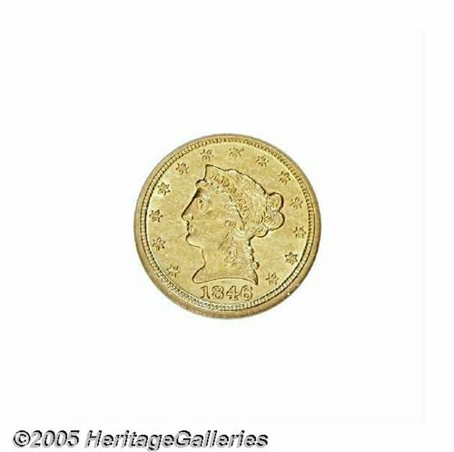 <B>1846-D<$2 1/2> AU58 NGC.</B></I> Variety 7-H. Bright and lustrous, with excellent surfaces and ample eye appeal. Liberty's cheek is clean and free of significant marks. Well struck by the dies with full stars and curls on the obverse, and even the eagle's claws are well formed. Scarce this nice and very difficult to find in higher grades. Population: 43 in 58, 10 finer (6/05).