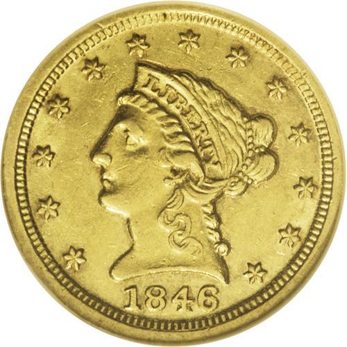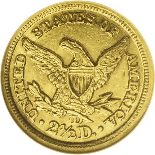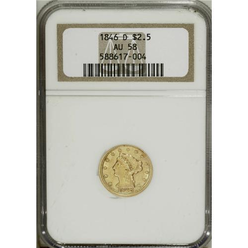 <B>1846-D $2 1/2 AU58 NGC.</B></I> Variety 7-K. This is the same dies as the 1846-D/D variety, which shows traces of an errant Dahlonega mintmark far left of the prominent mintmark. In this late die state, only the lower left serif of the misplaced D is present. A sharply struck and flashy example with no shortage of bright peripheral luster.<BR><BR><b>Shipping:</b> Coin/Currency (<a target="_blank" href="http://www.heritageauctions.com/common/shipping.php">view shipping information</a>)