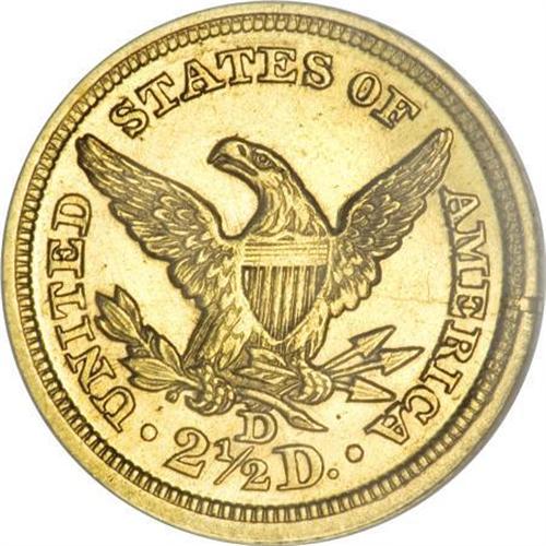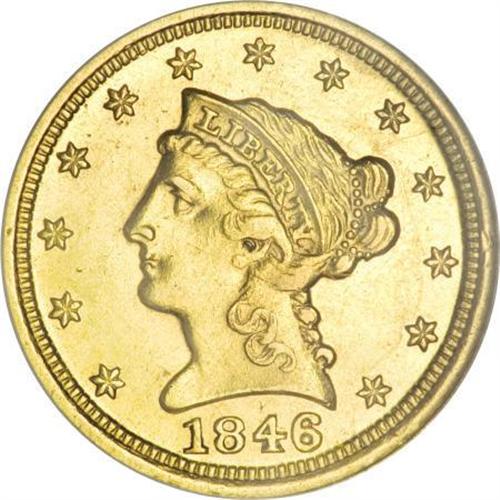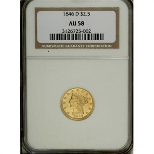 <B>1846-D $2 1/2 AU58 NGC.</B></I> Variety 7-J. Four different reverses are known, despite a mintage of only 19,303 pieces. A lustrous and untoned Borderline Uncirculated example with clean surfaces aside from a thin obverse mark near stars 10 to 13. Census: 49 in 58, 13 finer (11/07).<BR><BR><B>Coin Engraver:</B> Christian Gobrecht<BR><BR><b>Shipping:</b> Coins & Currency (<a target="_blank" href="http://www.heritageauctions.com/common/shipping.php">view shipping information</a>)