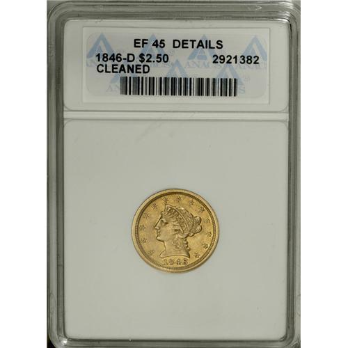 <B>1846-D $2 1/2 --Cleaned--ANACS. XF45 Details.</B></I> Variety 7-H. This olive-gold rare date quarter eagle is subdued by a mild cleaning, but the piece is free from mentionable marks, and the remaining luster is plentiful for the XF45 sharpness grade.<BR><BR><b>Shipping:</b> Coin/Currency (<a target="_blank" href="http://www.heritageauctions.com/common/shipping.php">view shipping information</a>)