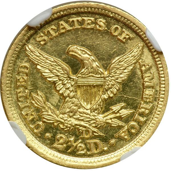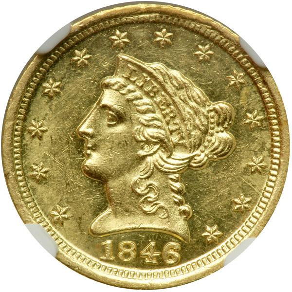1846-D. NGC graded MS-62. Well struck and untoned with lovely reflective surfaces. Only 19,303 minted. With a mintage moderately higher than other early Dahlonega dates in the 1840s, the 1846-D is one of the more available Dahlonega quarter eagles. There are perhaps 175-200 coins known with at least three-quarters of these in the Very Fine to Extremely Fine category. Low-end AU coins are reasonably easy to find, but the 1846-D becomes a challenging issue in the Mint State grades and a major rarity in MS-62 and above. The obverse is absolutely fully struck with no weakness on the hair or the denticles. On the reverse, some lightness shows on the denticles from 5 o'clock to 9 o'clock. The central reverse is bold and there is no sign of any weakness on the eagle's left (facing) leg.