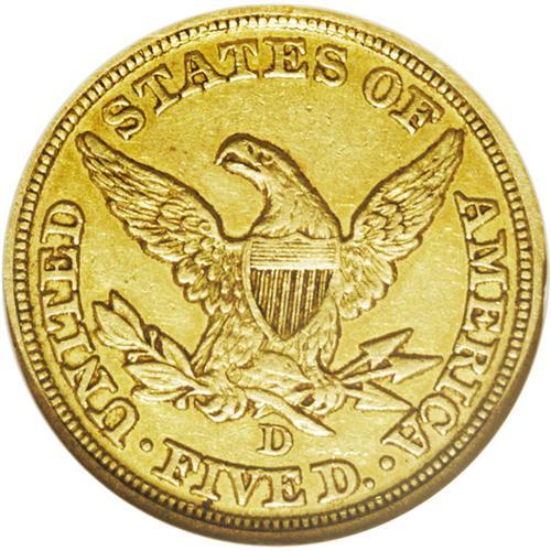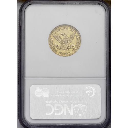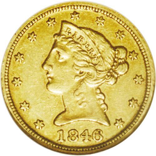 <B>1846-D<$5> AU53 NGC.</B></I> Variety 16-K. Normal Mintmark. An excellent, even strike with unusually sharp hair detail. Medium khaki-orange color rests atop satiny, slightly worn surfaces that are nearly blemish-free on both obverse and reverse. Extremely scarce and very underrated in this grade.<BR> The 1846-D Normal Mintmark is the third-rarest Dahlonega half eagle in high grades, and the sixth-rarest issue overall. The presently offered specimen is definitely in the upper echelons among survivors from this date and mint. Census: 7 in 53, 22 finer (2/06).