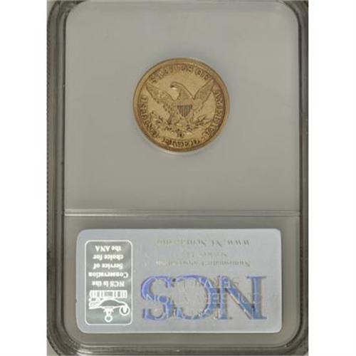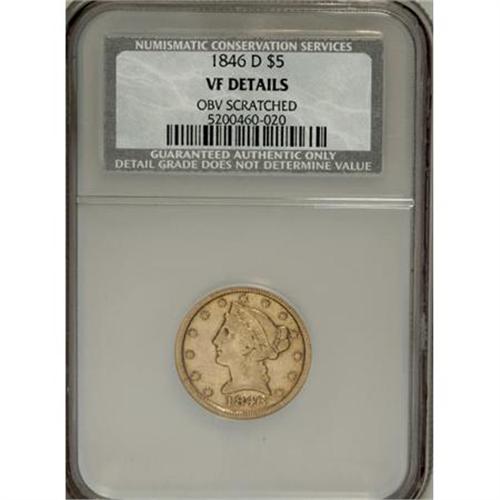 <B>1846-D $5 --Obverse Scratched--NCS. VF Details.</B></I> Variety 14-I. This honey-gold Dahlonega five is slightly bright and has a parallel pair of scratches above star 1. Liberty's hair and the eagle's neck are typically brought up.<BR><BR><B>Coin Engraver:</B> Christian Gobrecht<BR><BR><b>Shipping:</b> Coins & Currency (<a target="_blank" href="http://www.heritageauctions.com/common/shipping.php">view shipping information</a>)
