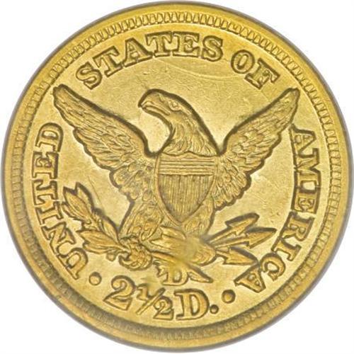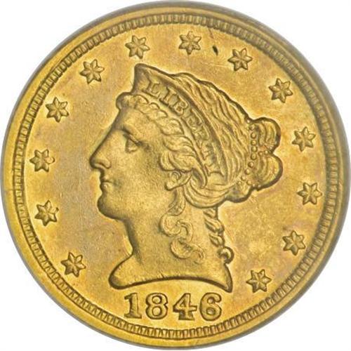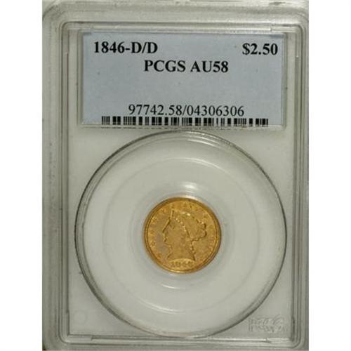 <B>1846-D/D $2 1/2 AU58 PCGS. CAC.</B></I> Variety 7-K. The rare early die state that shows remnants of an errant mintmark above the 1 in the fraction. Both sides exhibit overlapping sets of clash marks, as made. This well struck near-Mint Dahlonega five has an orange-red obverse. The reverse is canary-gold. Smooth aside from a hair-thin mark beneath the hairbun. Population: 4 in 58, 0 finer (11/07).<BR><BR><B>Coin Engraver:</B> Christian Gobrecht<BR><BR><b>Shipping:</b> Coins & Currency (<a target="_blank" href="http://www.heritageauctions.com/common/shipping.php">view shipping information</a>)
