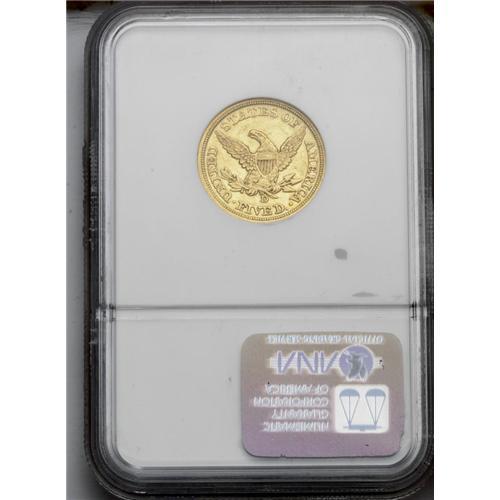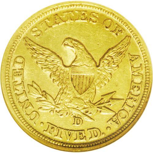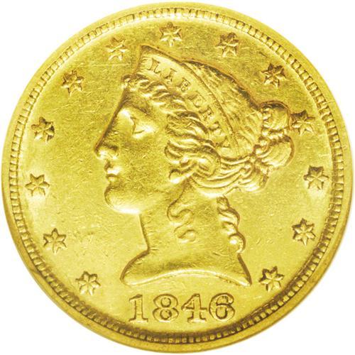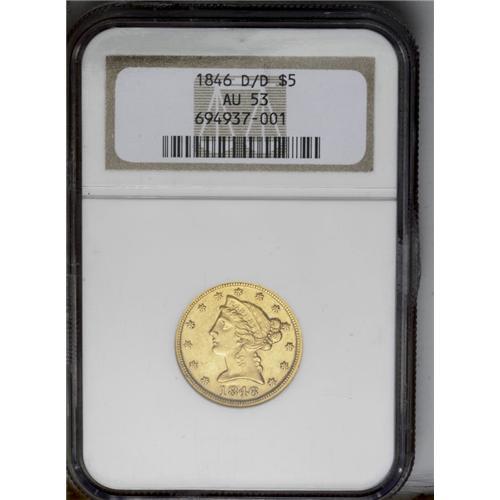 <B>1846-D/D<$5> AU53 NGC.</B></I> Variety 16-L. The "Low Date" variant of this dramatic repunched mintmark variety. The strike is sharp for a D-mint product, although determined naysayers might note that the love lock and the fletchings lack absolute definition. A minor obverse rim ding at 8 o'clock provides the sole mentionable contact. Luster is substantial for the AU53 level, and the intermediate (and practical) D-mint gold collector need look no further for a commendable example.