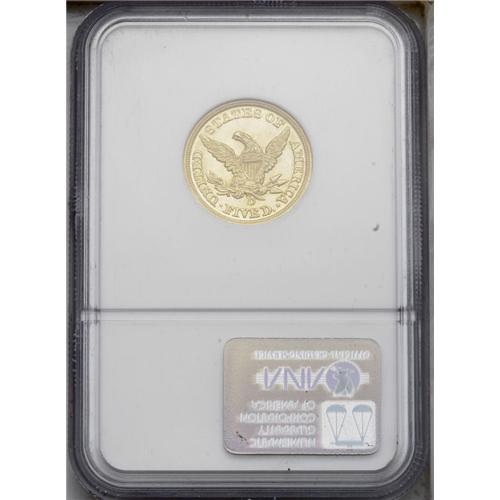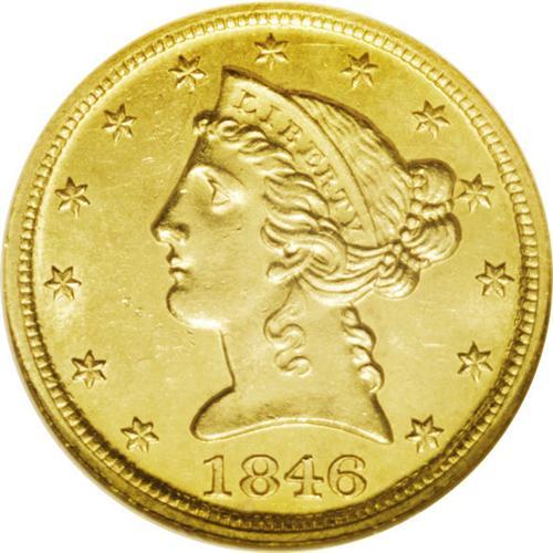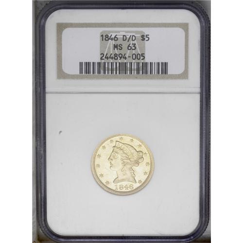 <B>1846-D/D<$5> MS63 NGC.</B></I> Variety 16-L. This popular variety is now an accepted part of the Dahlonega half eagle series and is collected by specialists along with the regular mintmark varieties. The D/D is usually a better struck coin than the normal mintmark variant, and this certainly holds true for this piece. The only portion of this coin that is not fully brought up are the fletchings of the upper arrow on the reverse. The fields are bright and have a suggestion of semi-reflectivity and the green-gold surfaces show just the merest suggestion of light reddish patina. The only mentionable surface flaw is a small milling mark in the left obverse field in front of the point of Liberty's chin. Census: 1 in 63, 2 finer (3/06). <BR><BR><B>Important notice:</B> Heritage usually auctions material at the rate of 200-250 lots per hour. On some occasions eBay Live bid software or the Internet may not be able to keep up with the pace of the auction. We recommend placing a realistic absentee bid now as insurance to avoid disappointment. Occasionally the auctioneer may eliminate or reject an eBay Live bid, and the auctioneer may also reopen a lot after the close of the eBay live bidding (usually because we missed an audience bid), and may reject your bid even if it shows you as the winning bidder. By bidding via eBay Live, you agree that Heritage may award the lot to another bidder at its sole discretion under the circumstances described above or any other reasonable circumstances. Since eBay bids are not shown to us until we open the lot on the floor, we treat those bids just like floor bids. In most cases the floor responds before the eBay bid is presented to us, due to Internet lag time, so for consistency we have made it a policy that floor bids are always considered first over tie eBay live bids. Also please note that all Heritage lots purchased through eBay Live carry a 20% Buyer's Premium. Please make sure you read the Terms and Conditions before you bid. This lot is being auctioned in conjunction with a live floor auction by Heritage Galleries & Auctioneers. All final auction and invoice information will be supplied by Heritage Galleries & Auctioneers, and all other information should be considered preliminary. Lot:2688 <BR><BR><B>Winning Notification and Billing:</B> After the FINAL session in this auction is complete, Heritage will send e-mail and snail mail invoices. This process normally takes several days. All final auction and invoice information will be supplied by Heritage Galleries & Auctioneers, and all other information should be considered preliminary. <BR><BR>This auction will be conducted on a live auction floor and over the Internet through eBay Live. If you choose to place an absentee bid, please take a moment to <font color='#0000ff'><u><a href='http://pages.ebay.com/liveauctions/help/before/laabsentee.html'>learn how eBay Live absentee bidding works</a></u></font><font color='#000000'>