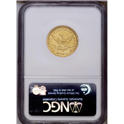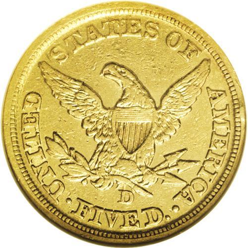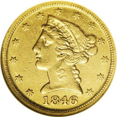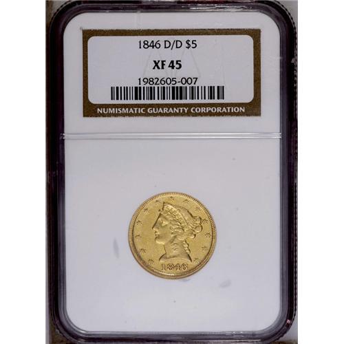 <B>1846-D/D<$5> XF45 NGC.</B></I> Variety 15-J. The mintmark was first punched far too high and buried in the device, then boldly repunched south. The '46-D/D is usually found in VF to XF grades, and is rare in AU. The Choice XF specimen offered here displays semi-bright peach and orange-gold surfaces with traces of luster in the protected areas. The design features show nice detail, though the top arrow feather and the eagle's neck reveal minor weakness. Light contact marks are evenly distributed over each side, as is typical for the issue.