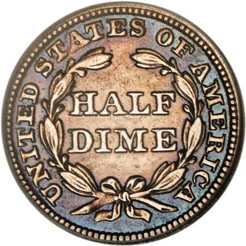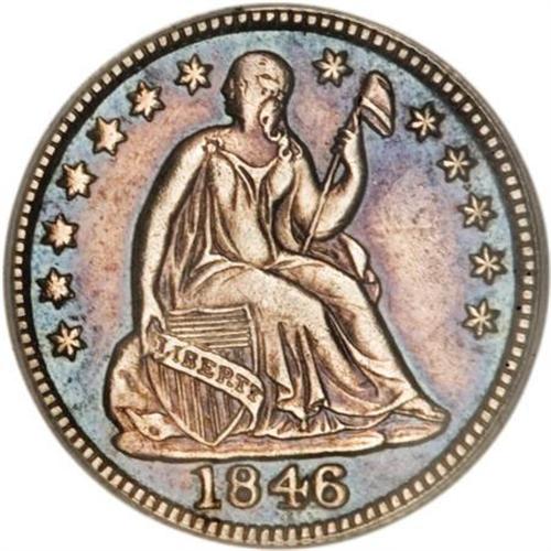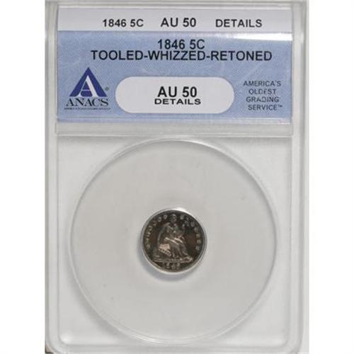 <B>1846 H10C --Tooled, Whizzed, Retoned--ANACS. AU50 Details.</B></I> V-1, the only known dies. The 1846 is the key date of the Stars Obverse half dime series. This impaired example shows deep purple-rose and electric-blue coloration. The fields are faintly granular from whizzing. Faint tooling marks are noted above Liberty's left (facing) shoulder and in the lower right obverse field. An affordable representative of this rare issue. <BR><BR><B>Coin Engraver:</B> Christian Gobrecht<BR><BR><b>Shipping:</b> Coins & Currency (<a target="_blank" href="http://www.heritageauctions.com/common/shipping.php">view shipping information</a>)