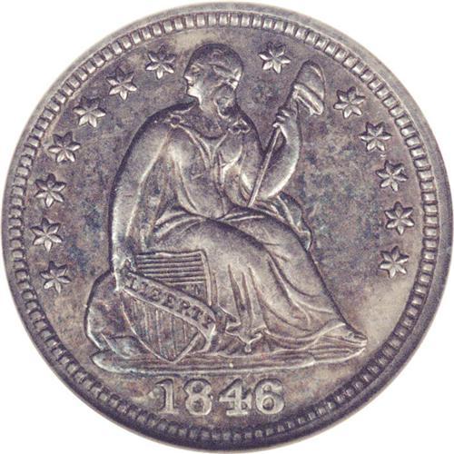 <B>1846 H10C AU53 ANACS.</B></I> Hints of luster are visible beneath deep gold and steel-blue toning. A few minor surface blemishes are visible on both sides, yet this coin is entirely pleasing and desirable. The date is one of the rarest in the entire Seated Liberty half dime series, and most survivors grade no better than Good, or possible VG at best. An excellent opportunity for the advanced collector.