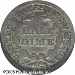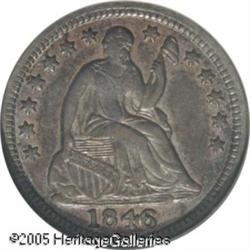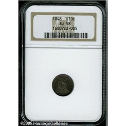 <B>1846 H10C AU58 NGC.</B></I> Among the half dimes in the present sale, this is one of the most important opportunities. Although it is hardly the most valuable example, it very well may be the rarest. Just 27,000 half dimes of this date were produced, the fifth lowest mintage of any Liberty Seated half dime (discounting the unique 1870-S issue), and the 10th lowest mintage of any date half dime from 1794 to 1873. This is a deeply toned example with nearly full underlying luster. The surfaces are excellent with only a few scattered marks. Somewhat weakly struck as nearly always. Population: 3 in 58, 1 finer (1/05). Lot:6124