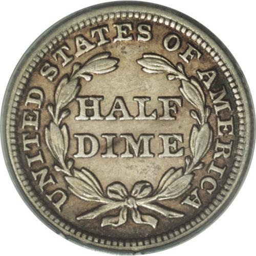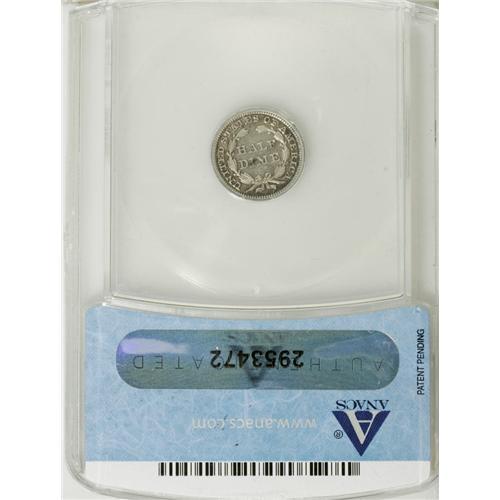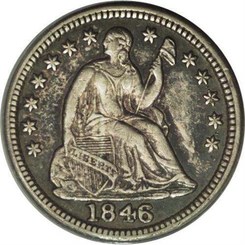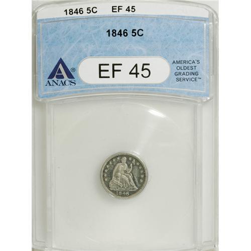 <B>1846 H10C XF45 ANACS.</B></I> V-1, the only variety of the year for business strikes. Proofs are from a different obverse die. A rare issue with only 27,000 pieces struck, and one of the key dates in the Seated half dime series. This example is boldly struck, if typically weak on the top of Liberty's head, with untoned centers, dark-green patina near the obverse periphery, and champagne-brown and dark-green toning near the reverse borders. Modestly worn on the highpoints for the grade, and free of sizeable surface blemishes.<BR><BR><b>Shipping:</b> Coins & Currency (<a target="_blank" href="http://www.heritageauctions.com/common/shipping.php">view shipping information</a>)