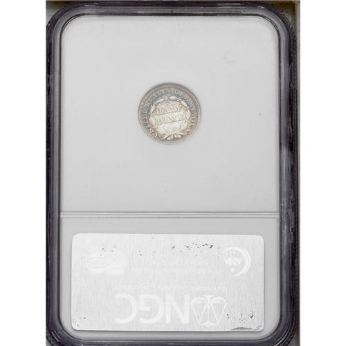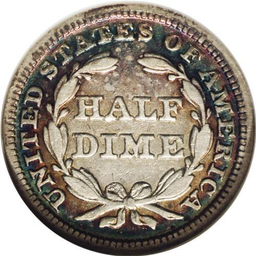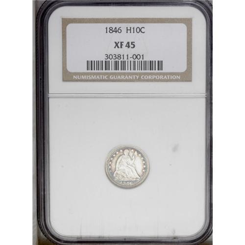 <B>1846<H10C> XF45 NGC.</B></I> One of the key dates in the Seated Liberty half dime series, which is very scarce in circulated grades and rare in Mint State. In Choice XF, the grade of the example offered in this lot, NGC and PCGS have certified a total of 6 pieces, and 22 examples finer. Moreover, our records indicate that five XF45 pieces have appeared at auction over the past 10 years, and nine coins grading higher. Deep turquoise, lavender, and russet toning gravitate to the margins, leaving the centers virtually untoned. Nice definition is noted on the design elements, as is typical for the issue. A few minute marks scattered about are consistent with the grade level.