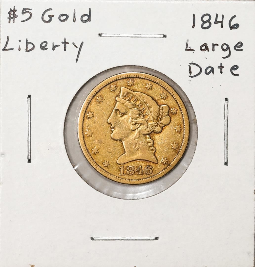 One 1846 Large Date $5 Liberty Head Half Eagle Gold Coin.