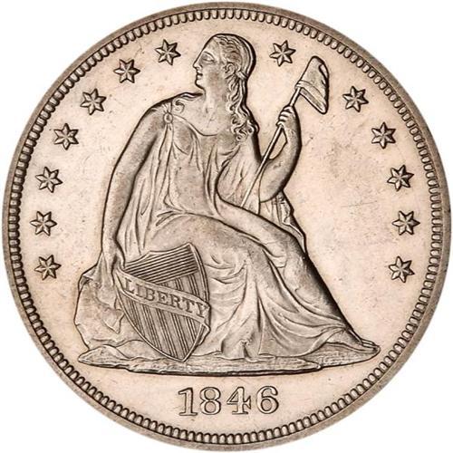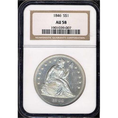 <b>1846 Liberty Seated Dollar. NGC graded AU58.</b> Well struck and generally free of abrasions other than for a few on both sides. A common date <b>(PCGS # 6932)</b> <i>