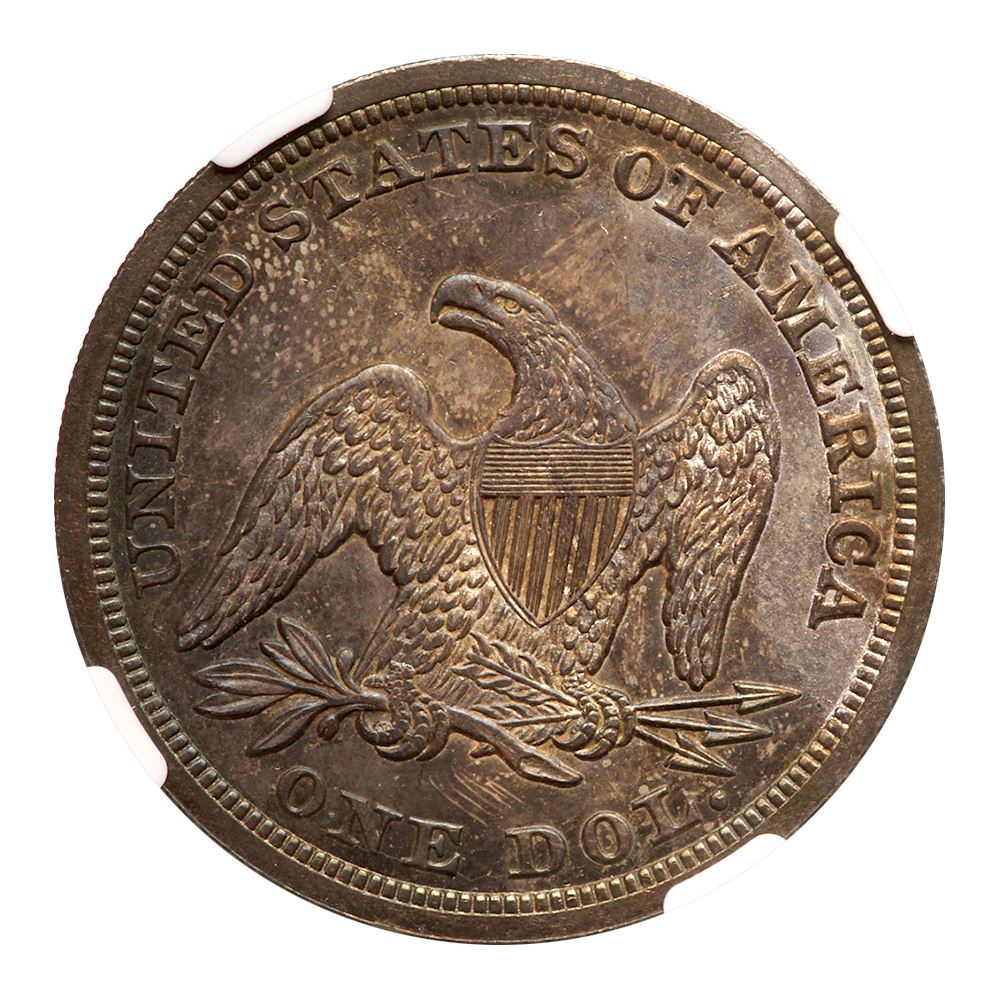 1846. NGC graded MS-65. Wow, here is an amazing coin! Precious few of these early Liberty Seated dollars were saved in high grades, and just a handful today are considered Gems like this stunning coin. The strike is sharp and all the devices are crisply defined. Toned with a blend of russet, gold and silver gray on both sides with luminous luster throughout. A scant 110,600 pieces were struck for the entire year, and survivors are few and far between, especially when a top grade example like this is desired. An opportunity which is not likely to be repeated anytime soon. Pop 2; 1 finer in 65+. Estimated Value 40,000 - UP