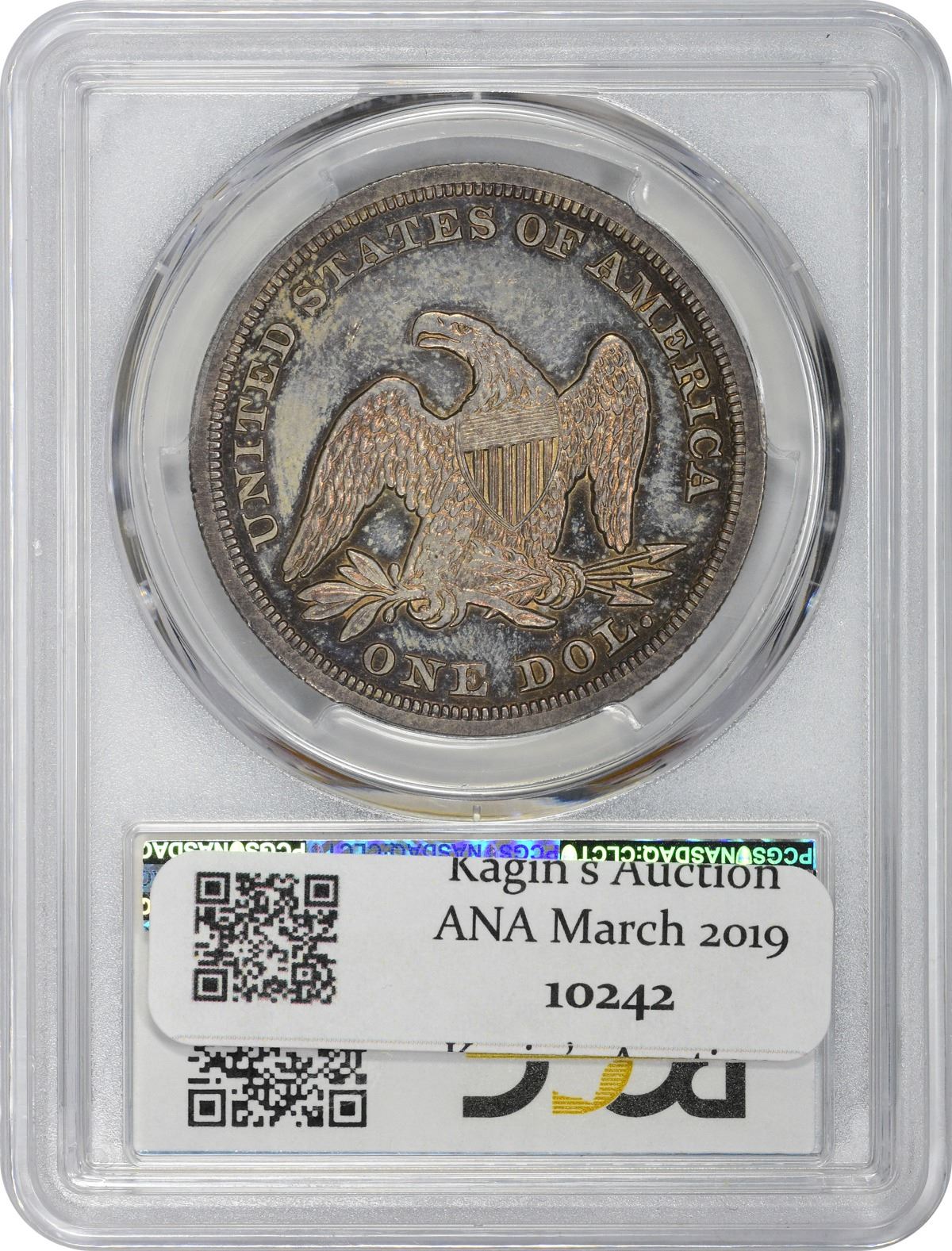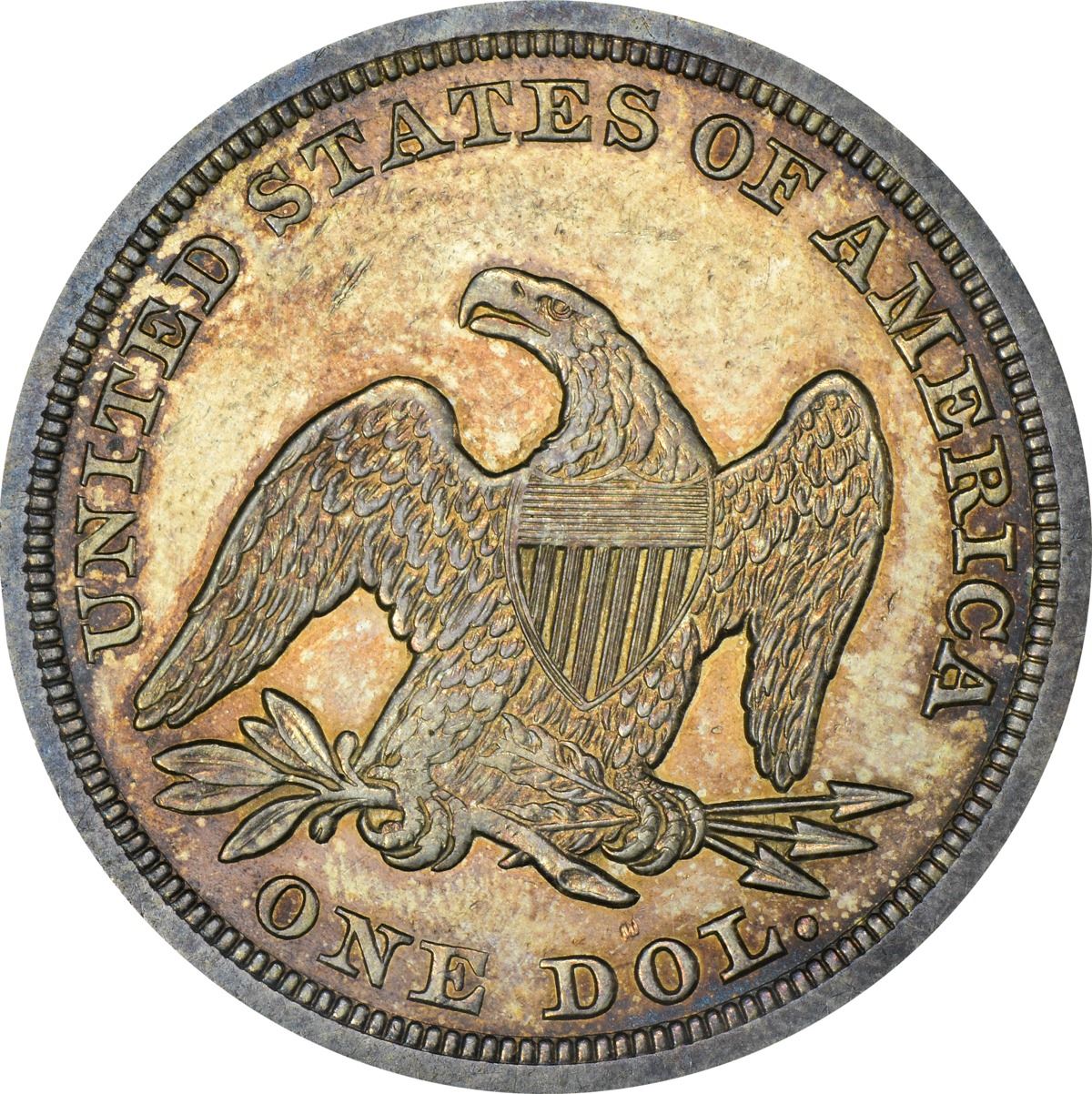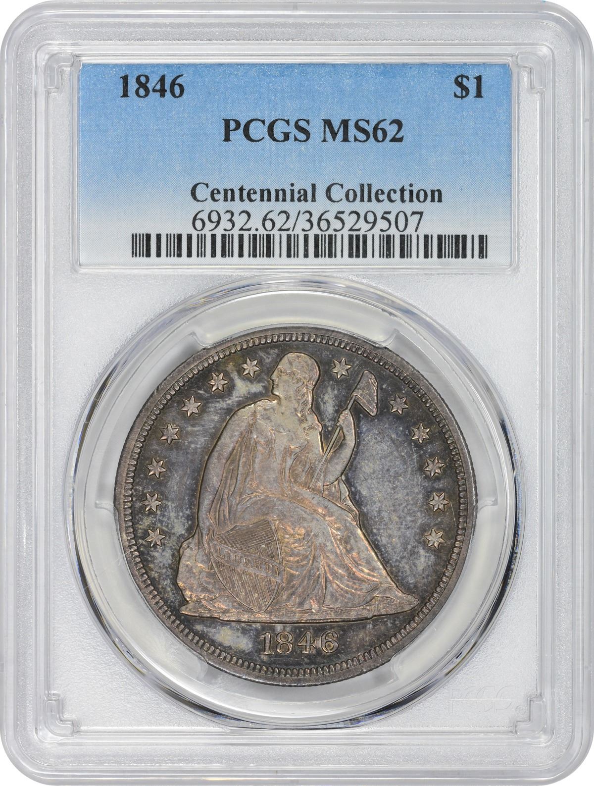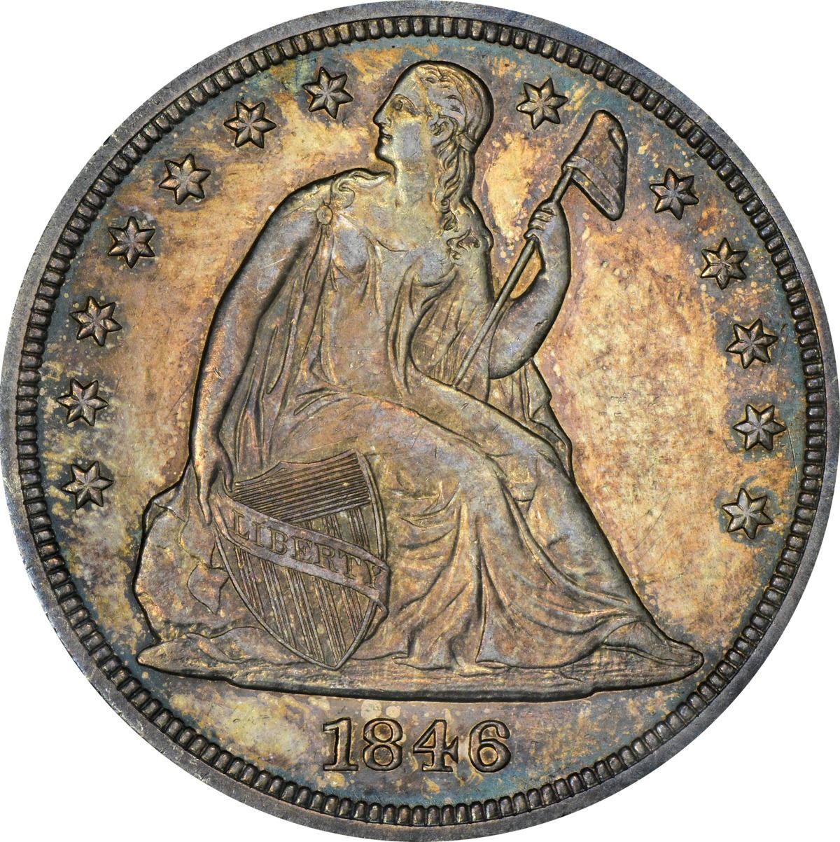 Fully prooflike in appearance with reflective golden-gray fields that deliver a huge supply of bright peach, orange, and neon-blue iridescence in a bold light source. Recognized by most as an otherwise common date, but like most dates in the series, the 1846 is elusive in Mint State. Indeed, fewer than 100 specimens have been certified as such by PCGS in the range from MS-60 to the finest seen at “only” MS-65. Don’t miss this opportunity if you are building a Mint State type set, for a lot of quality – and value – is oft to be found at the MS-62 level! PCGS #6932