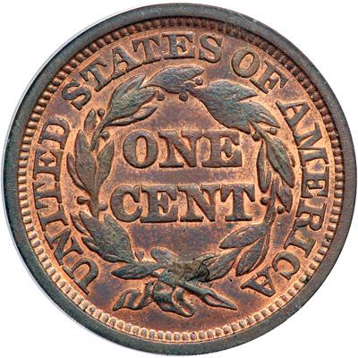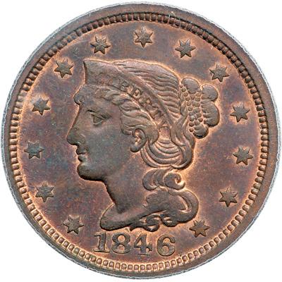 1846 N-10 R4. PCGS graded MS-63 Red & Brown. Frosty mint red fading to olive and chocolate brown with 15% of the red remaining on the obverse, 25% on the reverse. The only marks are specks of darker toning on the bottom of the wreath. This cent would rate a significantly higher grade if the strike was better. The profile, stars, shoulder, and many of the leaves in the wreath are softly impressed. MDS, die state a, before any rim cud breaks on the obverse. Our grade is MS60, CC#3 in the Grellman census for this tough die variety.