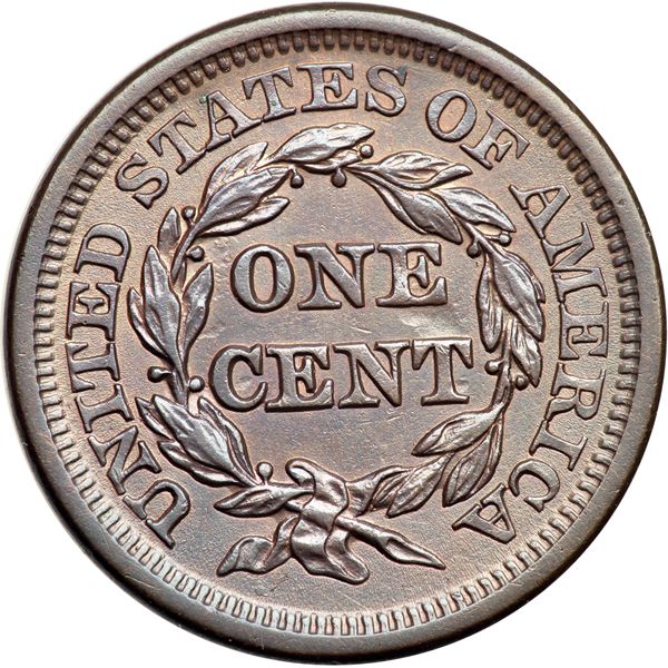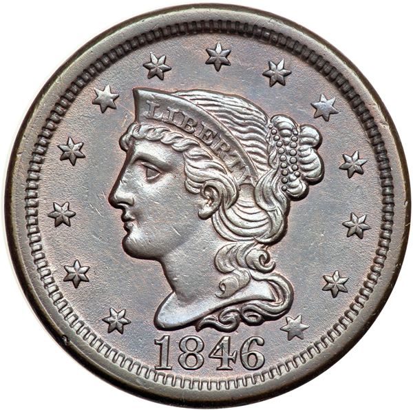 1846 N-14 R3 Tall Date EF40. Ten points sharper but cleaned and retoned frosty bluish steel and olive with faded reddish brown toning in protected areas. No spots or marks except for a shallow low spot under the E in ONE (caused by debris on the die). E-MDS, die state a. The repunching above the base of the 1 is clear. Holmes #1004.