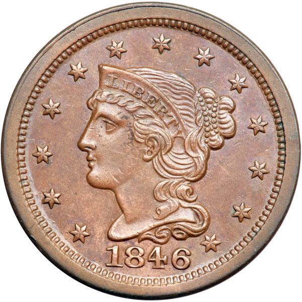 1846 N-15 R4+ AU50. Glossy medium brown with lighter brown toning on the highpoints of the lower half of the obverse. Delicate overtones of bluish steel show in protected areas. The fields are smooth and slightly reflective. The only notable marks are a very faint hairline across the cheek and a dull nick on the jawline above the throat. Rare earliest die state, die state a, with the obverse uncracked. CC#7 of the variety and third finest of the early die state. DWH #2220.