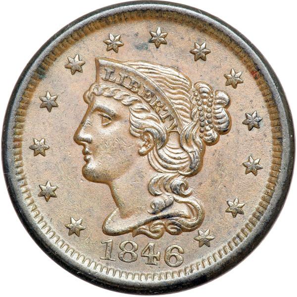 1846 N-18 R1 AU50. Frosty chocolate and steel with lighter brown toning in protected areas and darker steel on the highpoints. A small splash of dark toning off the left point of star 7 is the best identifying mark. LDS, die state f.