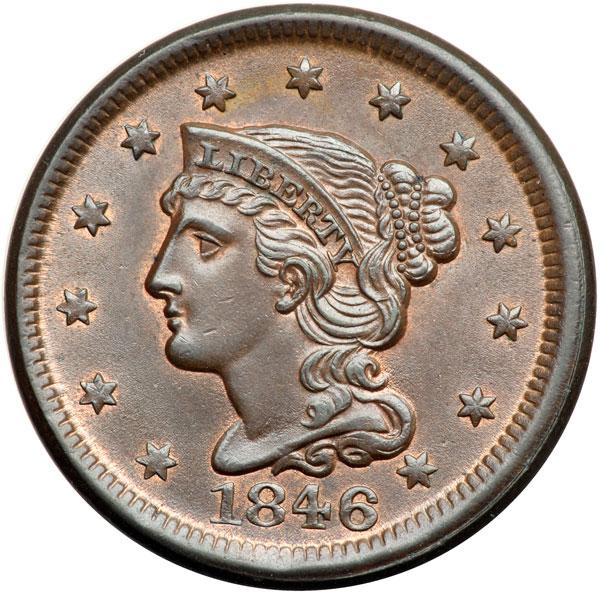 1846 N-18 R1 MS62. Lustrous steel brown with at least 10% of the mint red remaining, mostly on the reverse. The fields are satiny and nearly free of marks. A small, very light scuff in the field over star 8 and a small spot of reddish brown toning at the left side of N in CENT are the only defects, and they are trivial. LDS, die state f. The die cracks at MER are clear and a tiny lump has formed on the bottom edge of the outer hair bun. Strong strike doubling shows on much of the reverse, clearest at OF AMER. Removed from an NGC slab graded MS65BN (NGC label included). A beautiful cent, very close to MS63. Tied for CC#4 in the Grellman census. DWH #2057.