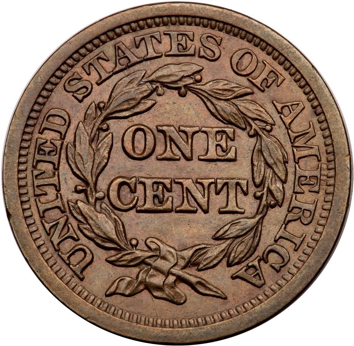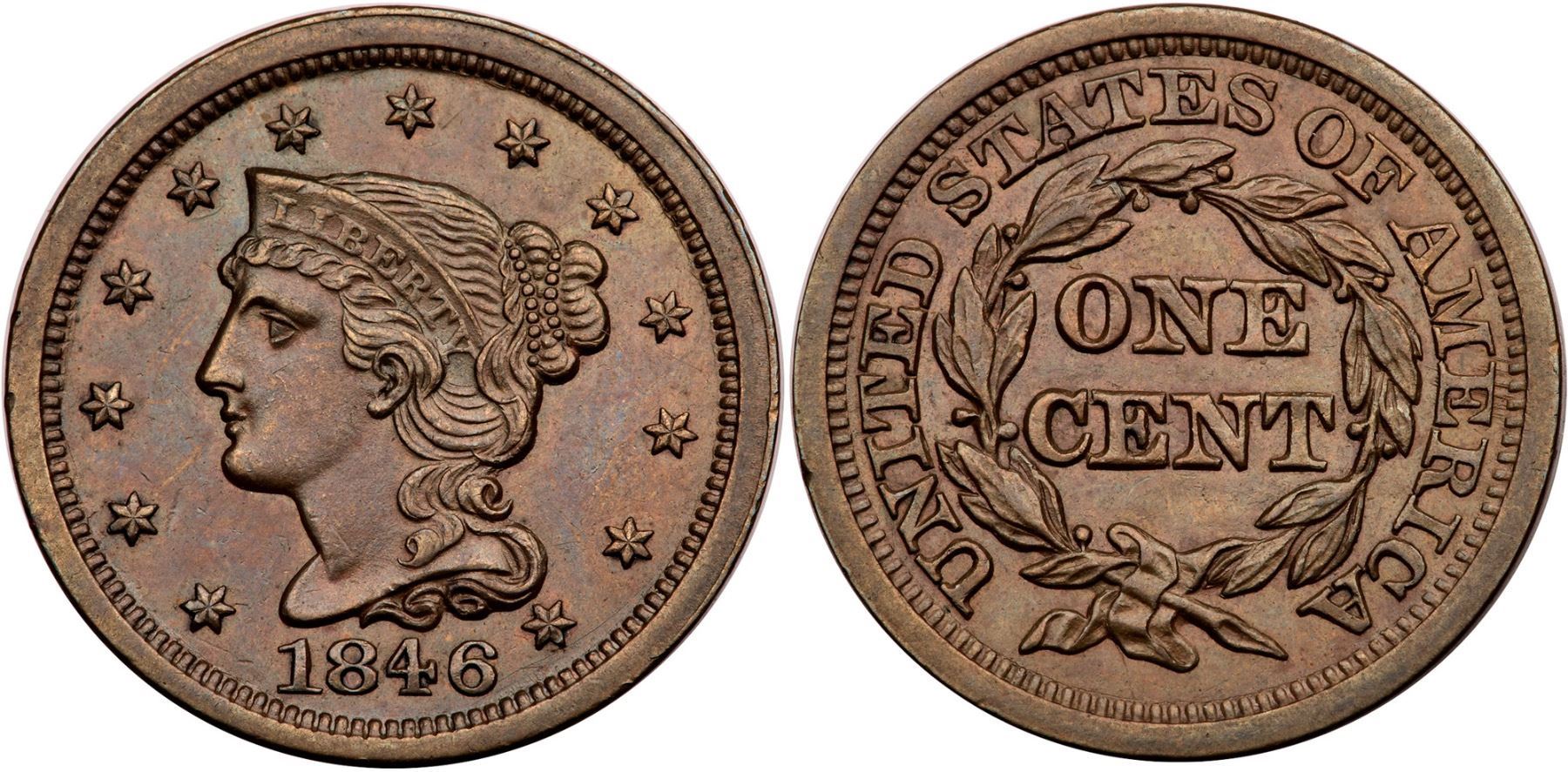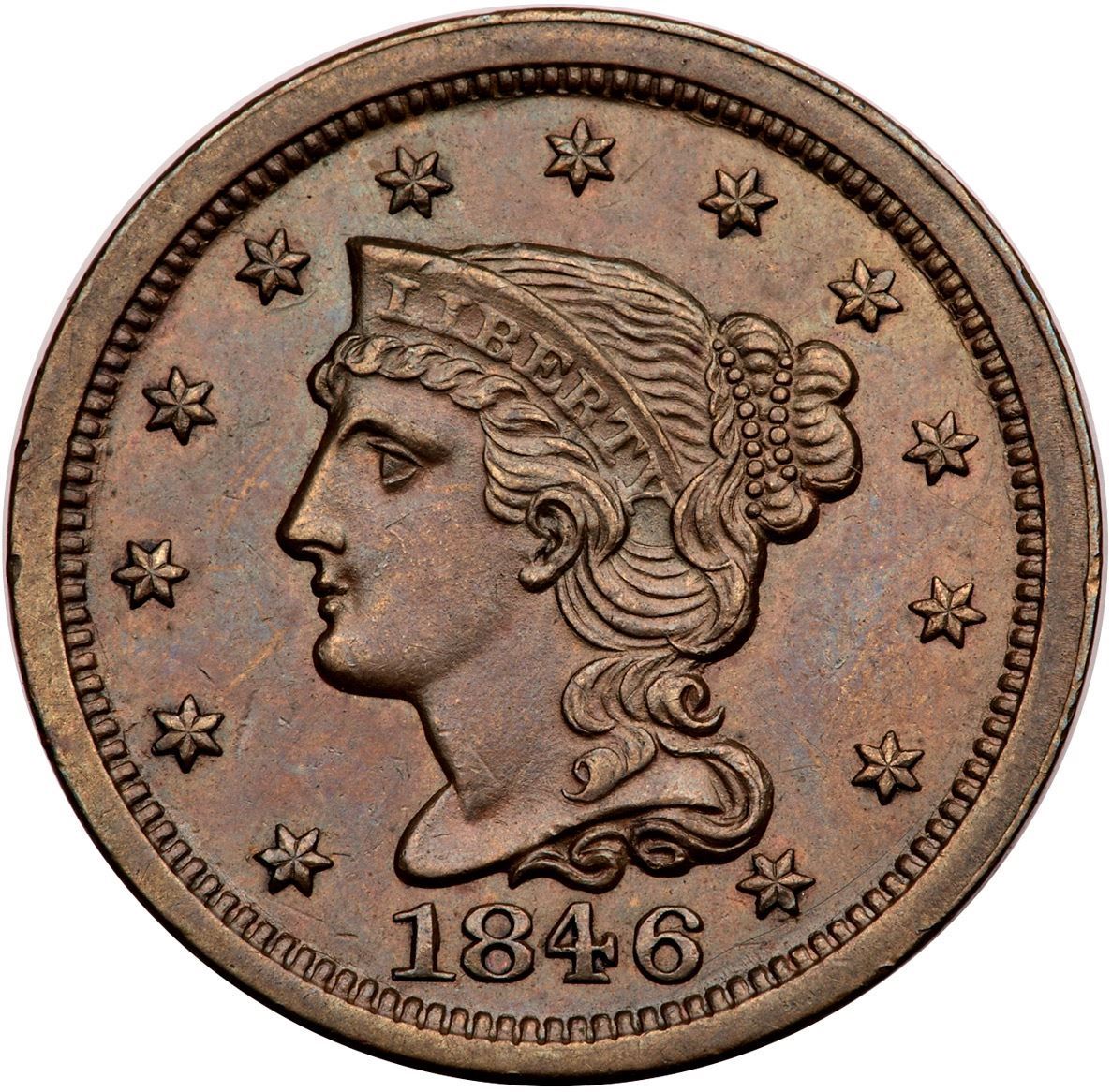 1846 N-19 R-3+ Small Date AU58Lustrous olive brown with underlying ruddy brown mellowed down from very faded mint red and subtle bluish steel tones. There are a few minor marks in the fields, the only notable one is dull nick right of star 2. Smooth, glossy surfaces. Grellman die state b.Certificate Number: Pedigree: Ex; George Ramont - Jules Reiver Collection HA 1/2005:20255 - Tom Reynolds 2011 EAC - Buck Burgess