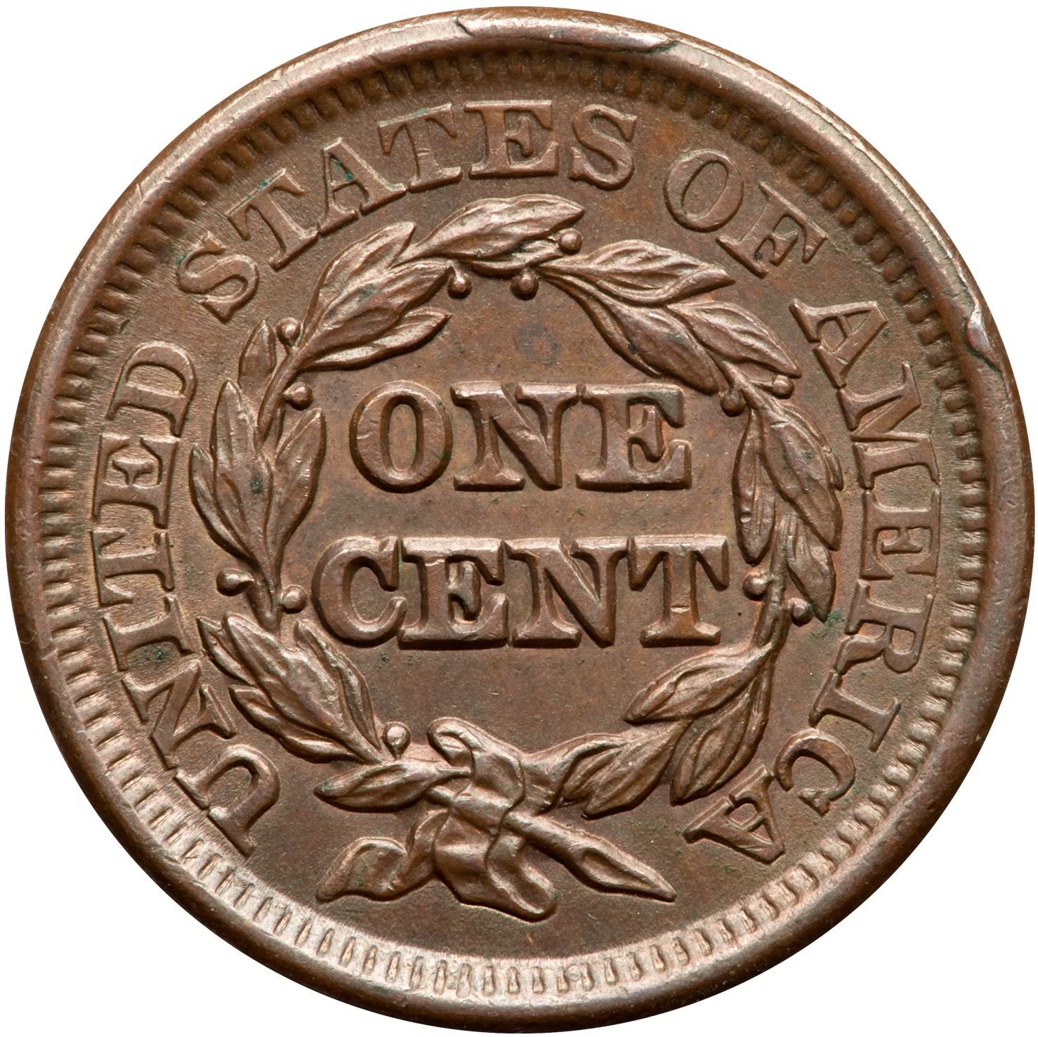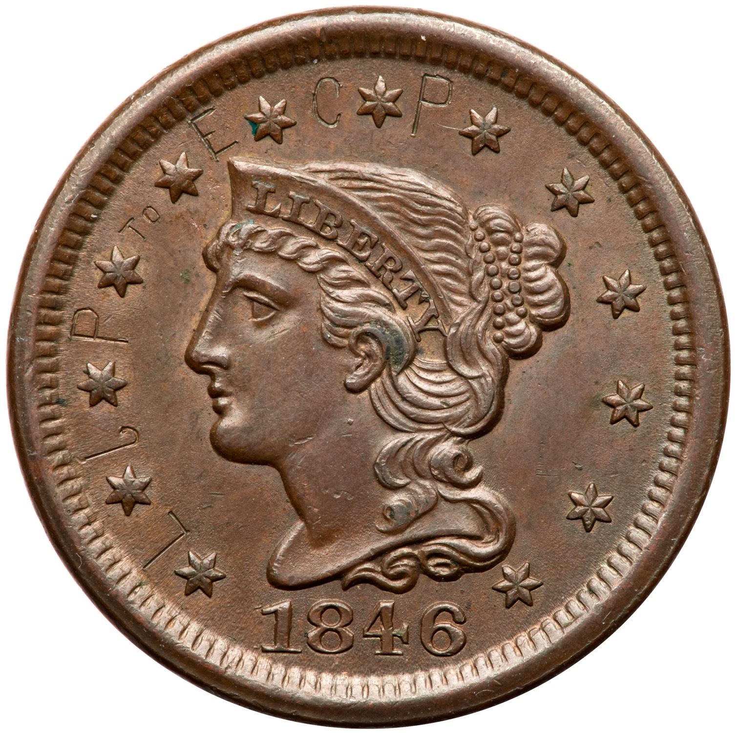 Sharpness AU50 or better but someone carefully engraved letters between stars 1-8 reading "L J P to E C P" (perhaps a love token). Otherwise this piece is choice with just a hint of rub on the highest points of the devices. Frosty medium steel brown and light olive. Sharply struck LDS, die state e, with bold rim cuds at ES and AM. Equal to the sharpest example of this die state in the Grellman census, and the strength of the cuds is a big plus since several of the known examples have weak cud breaks.