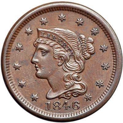 1846 N-2 R2. EF-45 Plus. Repunched 1. Close to AU50 with a few tiny ticks on the jaw and cheek, none notable or distracting. Frosty light chocolate and steel brown. Nicely struck and very attractive for the grade. MDS, die state c. Repunching is still clearly visible left of the peak and base of the 1.