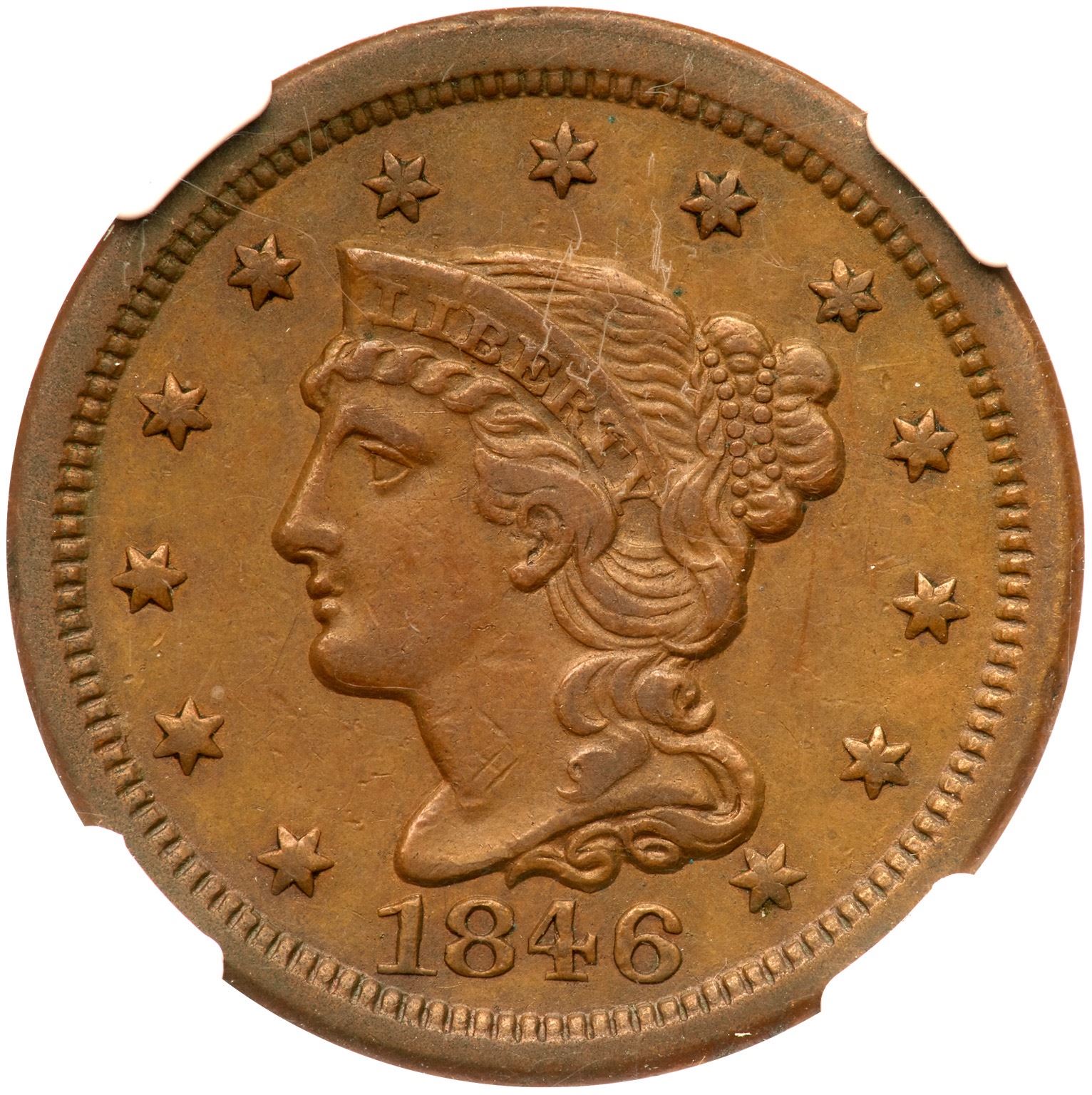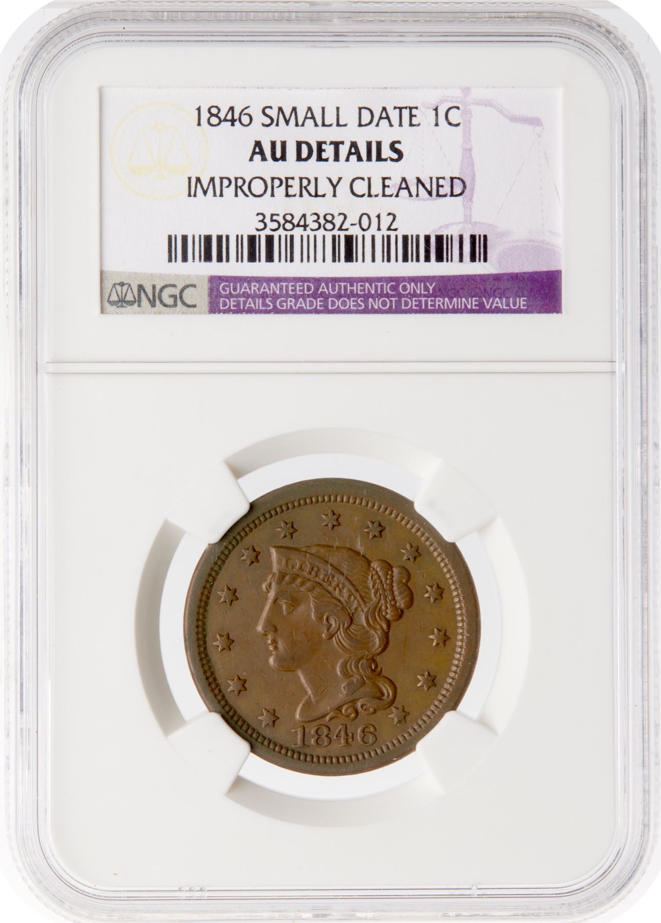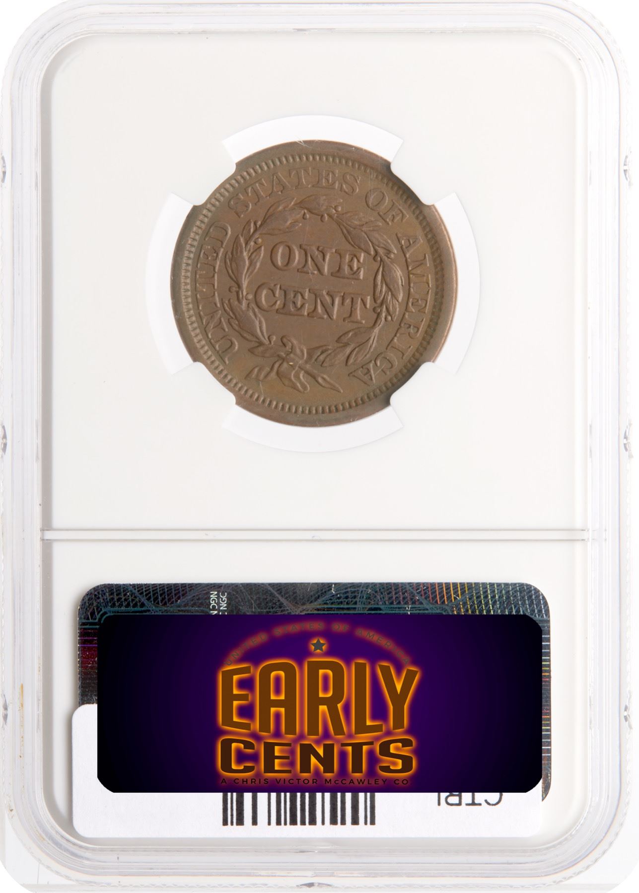 Frosty light olive. We detect no evidence of cleaning and the eye appeal of this cent is quite nice for a moderately worn cent. No marks, stains, or other defects. LDS, die state b, with a fine die crack at ATE in STATES and short die lines down from the dentils above that E. Our grade is VF25+.