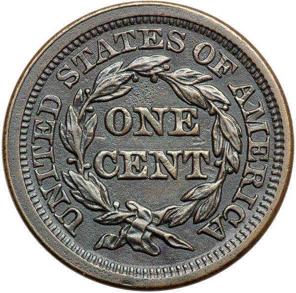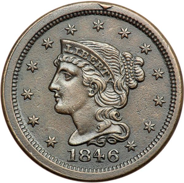 1846 N-21 R6 VF35. Ten points sharper with extremely fine roughness under a glossy chocolate and olive brown patina. No verdigris or notable contact marks. A small, curved struck-through line just right of the mouth can help identify this cent. Sharply struck terminal die state, die state b, with a small but strong triangular rim cud over star 7. Tied for CC#8 for the variety but CC#2 of only 8 known with the cud break. This is the plate coin for the die state in the 2001 edition of the Grellman book on late date cents. Noyes photo #30192. DWH #3229.