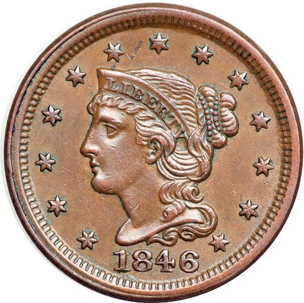1846 N-3 R2 EF45. Choice glossy medium brown and light chocolate with frosty luster peeking through in the protected areas. Great eye appeal for the grade. Rare M-LDS, die state c, with a clearly defined rim cud break over ES in STATES. Tied for CC#4 of the die state in the Grellman census.