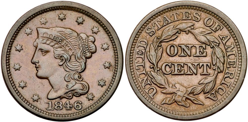 1846 N-4 R1 Boldly Repunched Date EF45Glossy light to medium brown. Smooth and attractive with light friction on the devices. E-MDS, die state b, with a fine die crack through MER). The tip of the coronet is not fully struck.Pedigree: From the Fred H. Borcherdt Collection