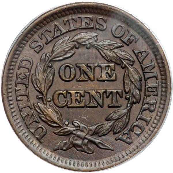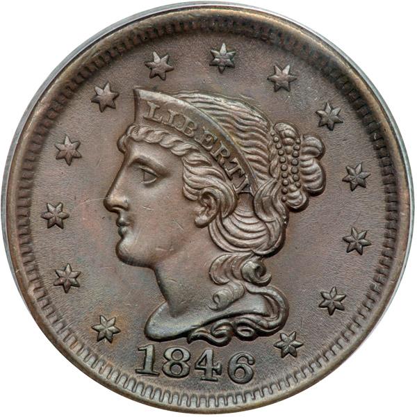 1846 N-5 R2 PCGS graded MS63 Brown. Repunched Date. Lustrous steel and light olive brown. The surfaces are covered with satiny mint frost that remains unbroken. Great eye appeal. No spots or stains, just a few trivial ticks on the rims. The best identifying mark is a tiny planchet flake on the upper half of the I in UNITED, as struck. MDS, die state c, displaying a thin rim cud break at star 11 and fine die polishing lines down through ES in STATES. The repunching is visible on all 4 digits of the date, strongest under the base of the 1. Our grade is MS60+, tied for CC#5 in the Grellman census. The attribution is noted on the PCGS label. Pop 1; 1 finer in 65BN.