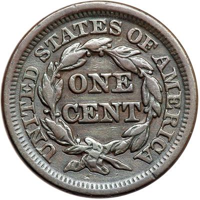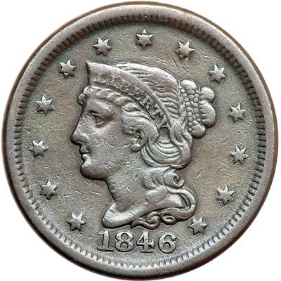 1846 N-5 R2. VF-20. Repunched Date. Rim cuds over STATE. Glossy steel and light olive, possibly lightly cleaned and retoned. The only notable marks are a few small rim nicks on the reverse. Rare LDS, die state g, with rim cud breaks at STATE. A small void in the cud shows over the first T in STATES. These rim cuds are not strong but they are outlined at the ends so the die state is easy to determine. Tied for CC#2 of no more than a half dozen known in this state.