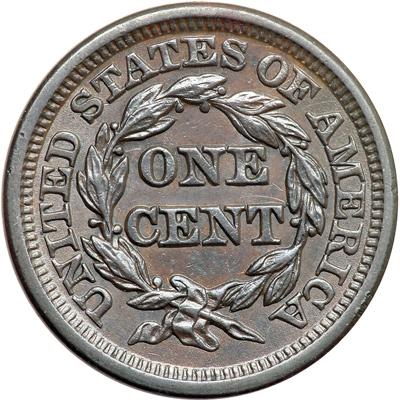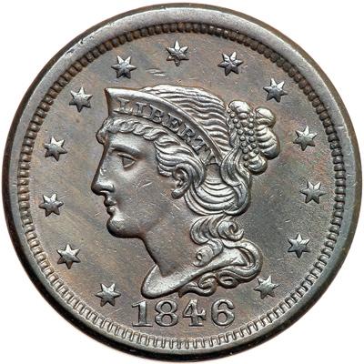 1846 N-6 R1. AU-50. Repunched 46. Glossy olive and steel with frosty luster covering the protected areas. No defects. Sharply struck with excellent eye appeal. MDS, die state b. The repunching at the 46 is clear.
