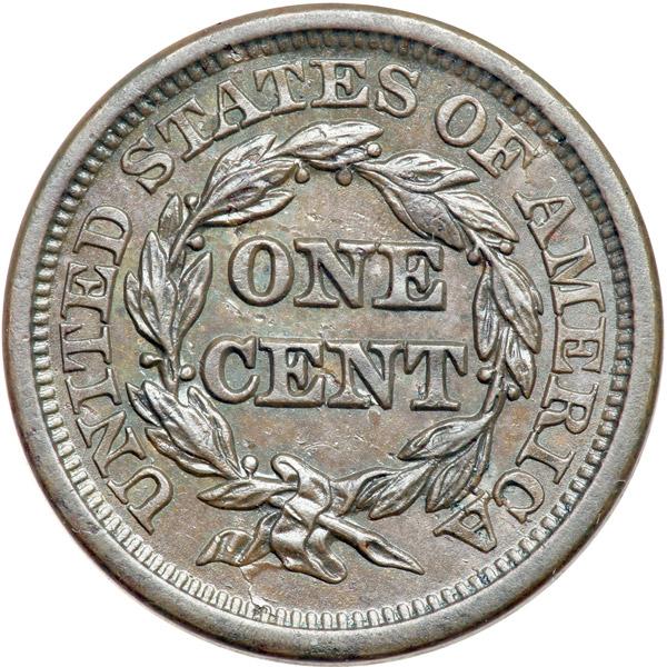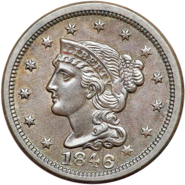 1846 N-8 R1 AU58. Lustrous olive brown and steel. This is a sharply struck mint state example, but there are numerous tiny planchet flakes on the reverse. These flakes are mint-made flaws, but they still affect the eye appeal on that side. Sharply struck EDS, die state a. All the fine die preparation lines are clear.