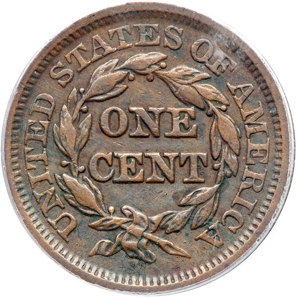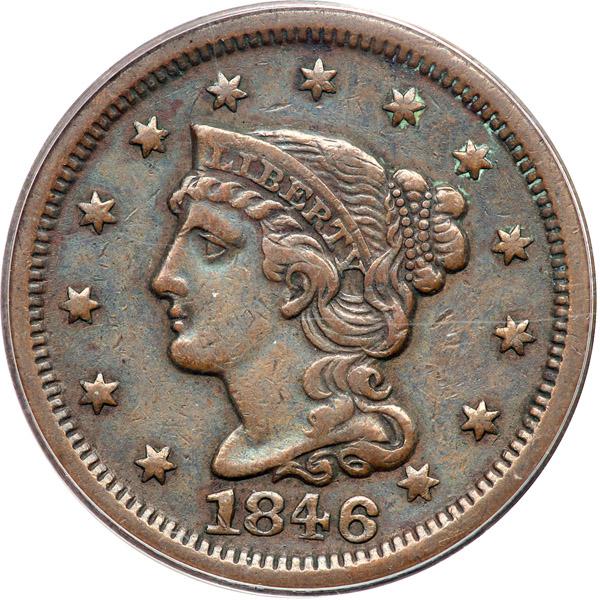 1846 N-8 R1. PCGS graded EF-45. Glossy light olive brown and chocolate with lighter brown toning on the highpoints. No defects, just light wear. M-LDS, die state b. The die lines at the throat are faint. Our grade is VF30. Although the PCGS label identifies this as the Newcomb-19 variety, it is Newcomb-8.