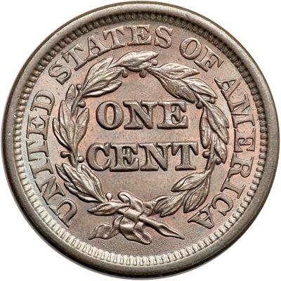 1846 N-8 R1. MS-62 Plus. Very attractive lustrous bluish steel and light olive brown with traces of faded mint color on both sides. An absolutely choice example except for a barely visible scrape on the outside edge of the rim at star 4. Nicely struck E-MDS, die state a. The die lines at the throat and behind the N in ONE are clear. Tied for CC#10.
