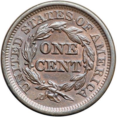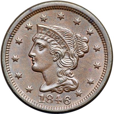 1846 N-8 R1. MS-60. Lustrous steel and chocolate brown with traces of faded mint color on both sides, especially on the reverse. No stains, spots, or contact marks. Excellent eye appeal for the grade. E-MDS, die state a. The die lines at the neck and N in ONE are clear.