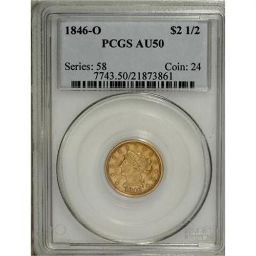 <B>1846-O $2 1/2 AU50 PCGS.</B></I> A luminous gold-orange example of this popular O-mint quarter eagle issue, minimally marked with only light, even wear. The central devices show typical striking softness, particularly on the reverse, but the overall eye appeal is solid.<BR><BR><B>Coin Engraver:</B> Christian Gobrecht<BR><BR><b>Shipping:</b> Coins & Currency (<a target="_blank" href="http://www.heritageauctions.com/common/shipping.php">view shipping information</a>)