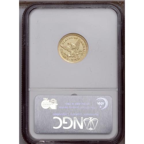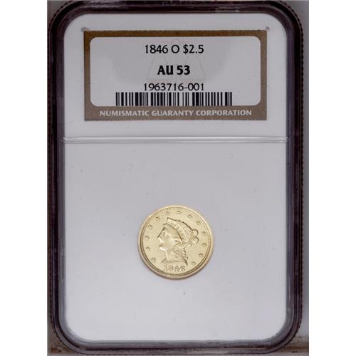 <B>1846-O<$2 1/2> AU53 NGC.</B></I> The 6 in the date is recut. A bright O-mint quarter eagle that has only one mentionable mark, located beneath the jaw. The centers are typically struck. The scarcer reverse die with the mintmark distant from the claw.
