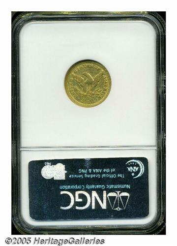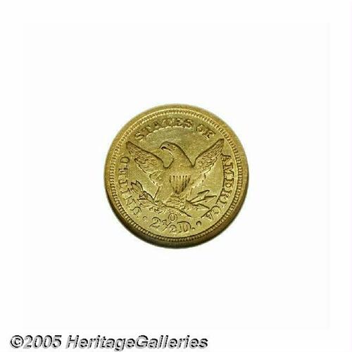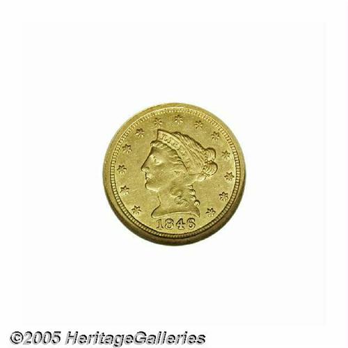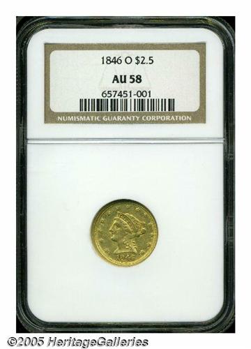 <B>1846-O<$2 1/2> AU58 NGC.</B></I> An attractive example with nearly full luster on both sides, yet with considerable weakness at the central areas of both sides. Lustrous greenish-gold surfaces with minor imperfections. Despite a generous mintage of 62,000 coins, few high-grade survivors exist. The typical representative of this coinage issue grades just VF or XF.
