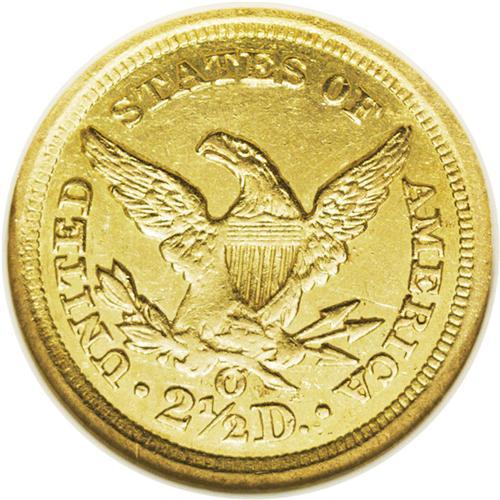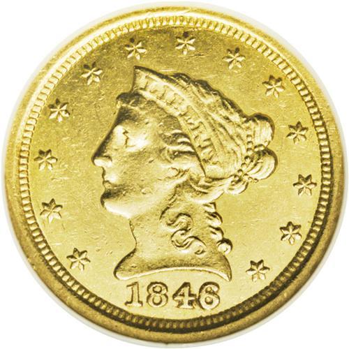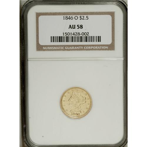 <B>1846-O<$2 1/2> AU58 NGC.</B></I> An attractive example with nearly full luster on both sides, yet with considerable weakness at the central areas of both sides. Lustrous yellow-gold surfaces with minor imperfections. Despite a generous mintage of 62,000 coins, few high-grade survivors exist. The typical representative of this coinage issue grades just VF or XF.