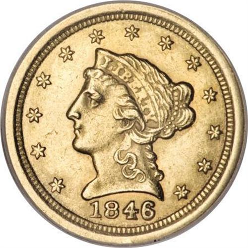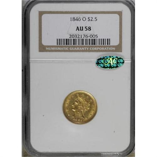 <B>1846-O $2 1/2 AU58 NGC. CAC.</B></I> This scarce-date O-mint representative displays ample luster on the bright yellow-gold surfaces imbued with hints of light tan. The design elements are well struck, except for the usual weakness in the left (facing) leg. Refreshingly clean surfaces add to the coin's overall appeal. Census: 51 in 58, 24 finer (3/08).<BR><BR><B>Coin Engraver:</B> Christian Gobrecht<BR><BR><b>Shipping:</b> Coins & Currency (<a target="_blank" href="http://www.heritageauctions.com/common/shipping.php">view shipping information</a>)