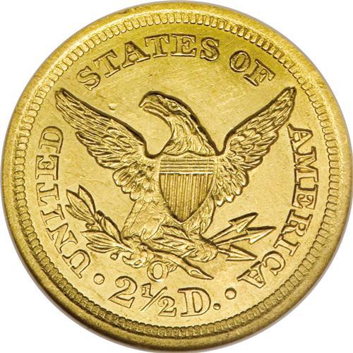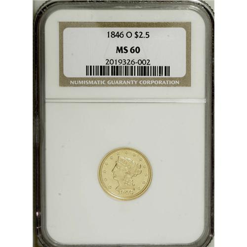 <B>1846-O $2 1/2 MS60 NGC.</B></I> A delightful example that is sharply struck with essentially full and complete design features on each side. The only exception is usual weakness on the eagle's leg, from the left side of the shield down to the claw below. Although minor hairlines and abrasions are visible, the brilliant yellow gold surfaces are reflective and almost prooflike in appearance. This is an extremely important opportunity to acquire a rare issue. Just 62,000 examples were struck, and few have survived in full Mint State condition.<BR><BR><b>Shipping:</b> Coins & Currency (<a target="_blank" href="http://www.heritageauctions.com/common/shipping.php">view shipping information</a>)