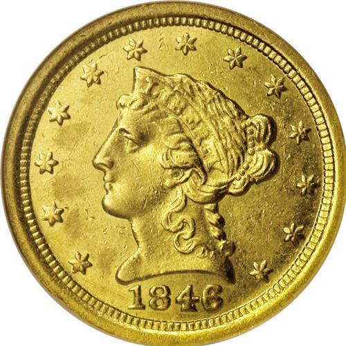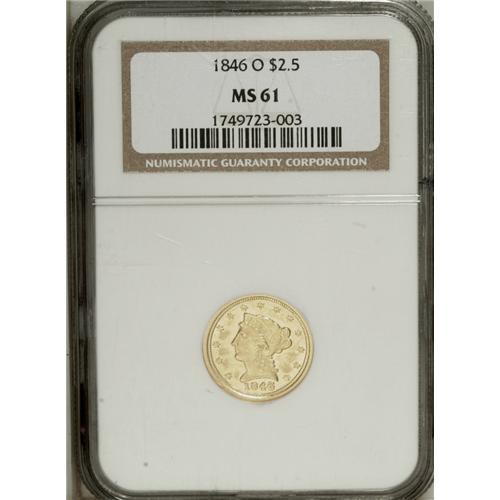 <B>1846-O<$2 1/2> MS61 NGC.</B></I> Softly struck, as virtually always found, yet an attractive bright gold coin with semi-prooflike surfaces peering out from behind a few luster breaks in the obverse fields. A number of contact marks limit the grade. The 1846-O quarter eagle is not considered a rarity in lower grades, yet is much tougher to find in Mint State than might be indicated by its relatively plentiful mintage of 62,000 coins.<BR><I>From The Della Collection.</B></I>