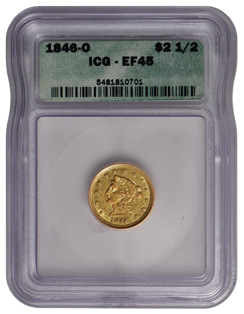 One 1846-O $2.5 Liberty Quarter Eagle Gold Coin ICG EF45.