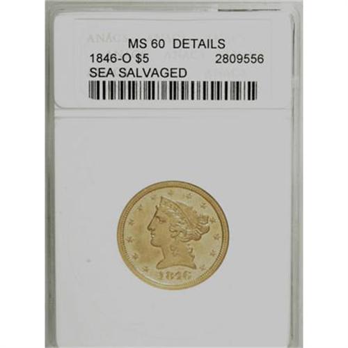 <B>1846-O $5 --Sea Salvaged--ANACS. MS60 Details.</B></I> Sharply struck for an O-mint No Motto five, with only a hint of softness on the lovelock, fletchings, and claws. There is no indication of highpoint wear, but the luster is diminished and the pale orange-gold surfaces appear granular once viewed beneath a loupe.<BR><BR><B>Coin Engraver:</B> Christian Gobrecht<BR><BR><b>Shipping:</b> Coins & Currency (<a target="_blank" href="http://www.heritageauctions.com/common/shipping.php">view shipping information</a>)